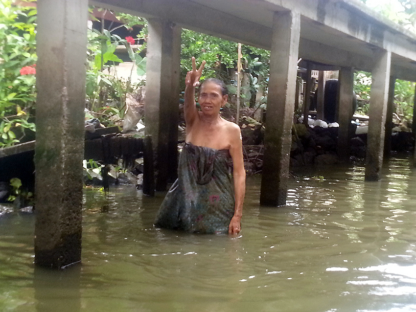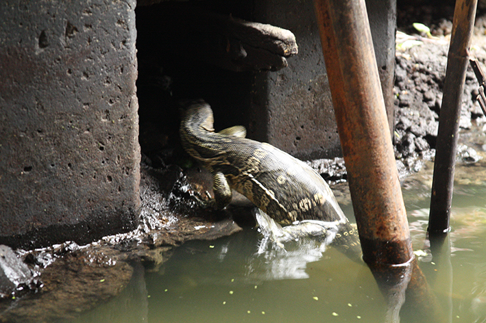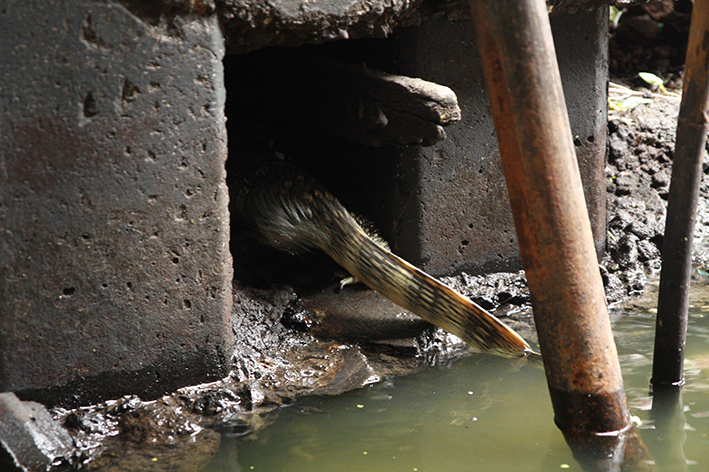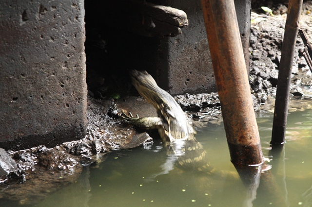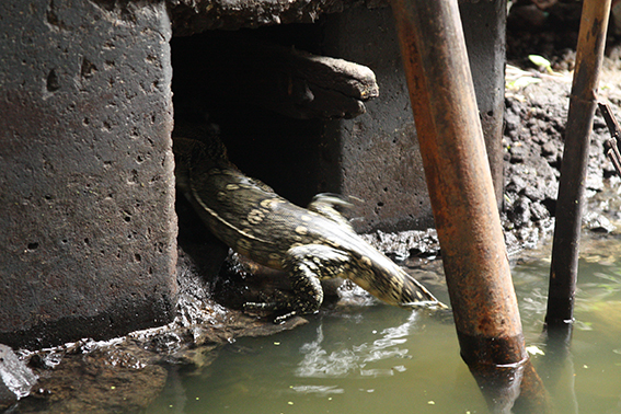 Teknelerin dalgalandırdığı suyun içindeki; çubuktan ayakları olan gecekondu ve dükkanların arasından yol alırken bir komodo ejderiyle karşılaşıyoruz. İlgiyle kendisini izlediğimizi görünce en yakındaki duvar çatlağından içeri kaçıyor.